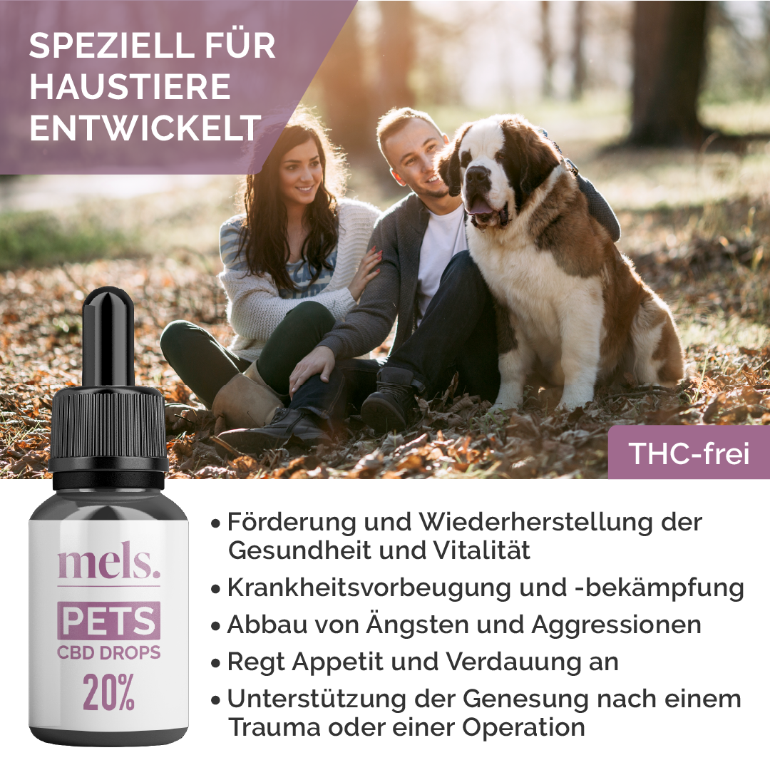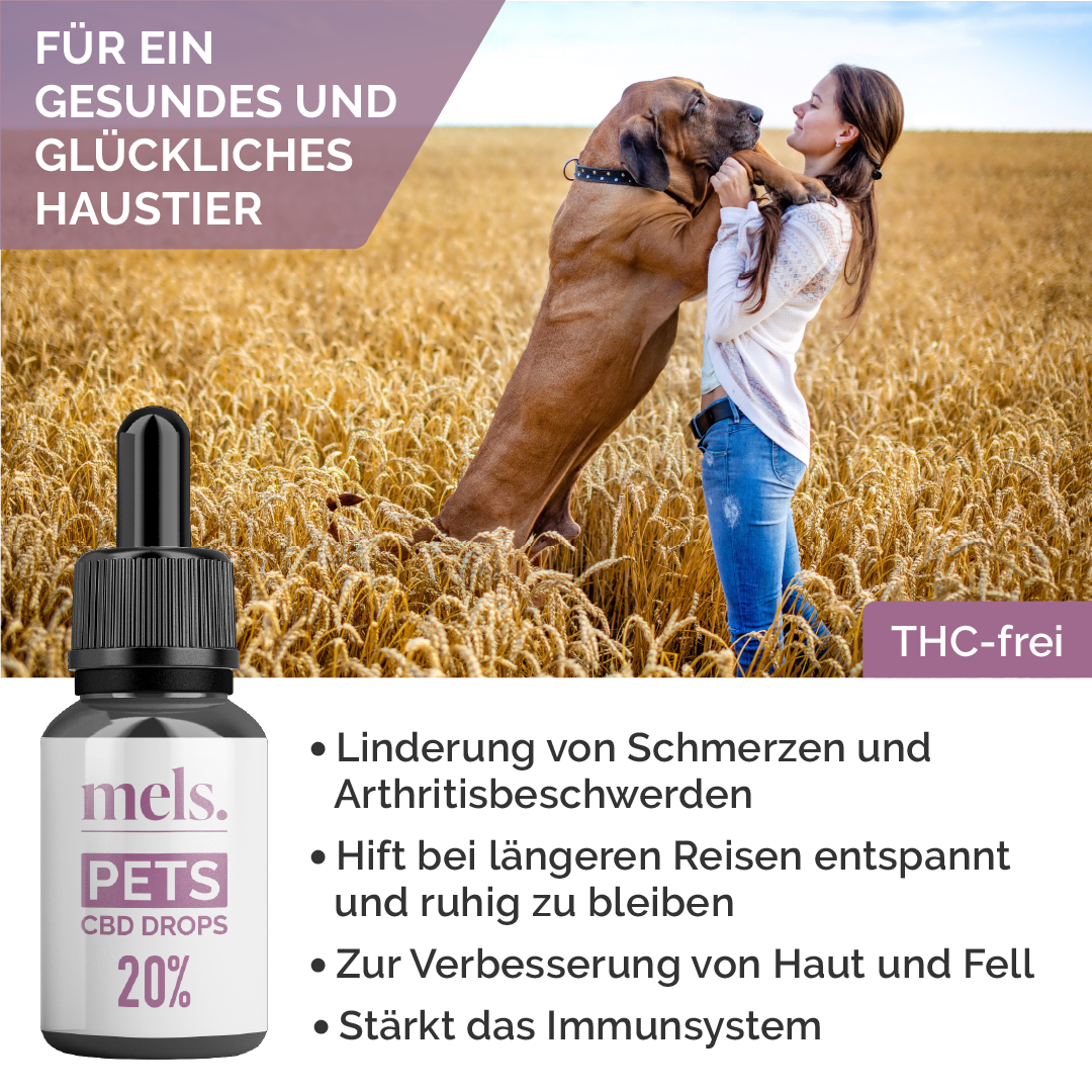 Mels PETS CBD Drops sind speziell entwickelt und nur für Haustiere bestimmt. CBD kann nicht als Ersatz für eine gesunde und abwechslungsreiche Ernährung verwendet werden.